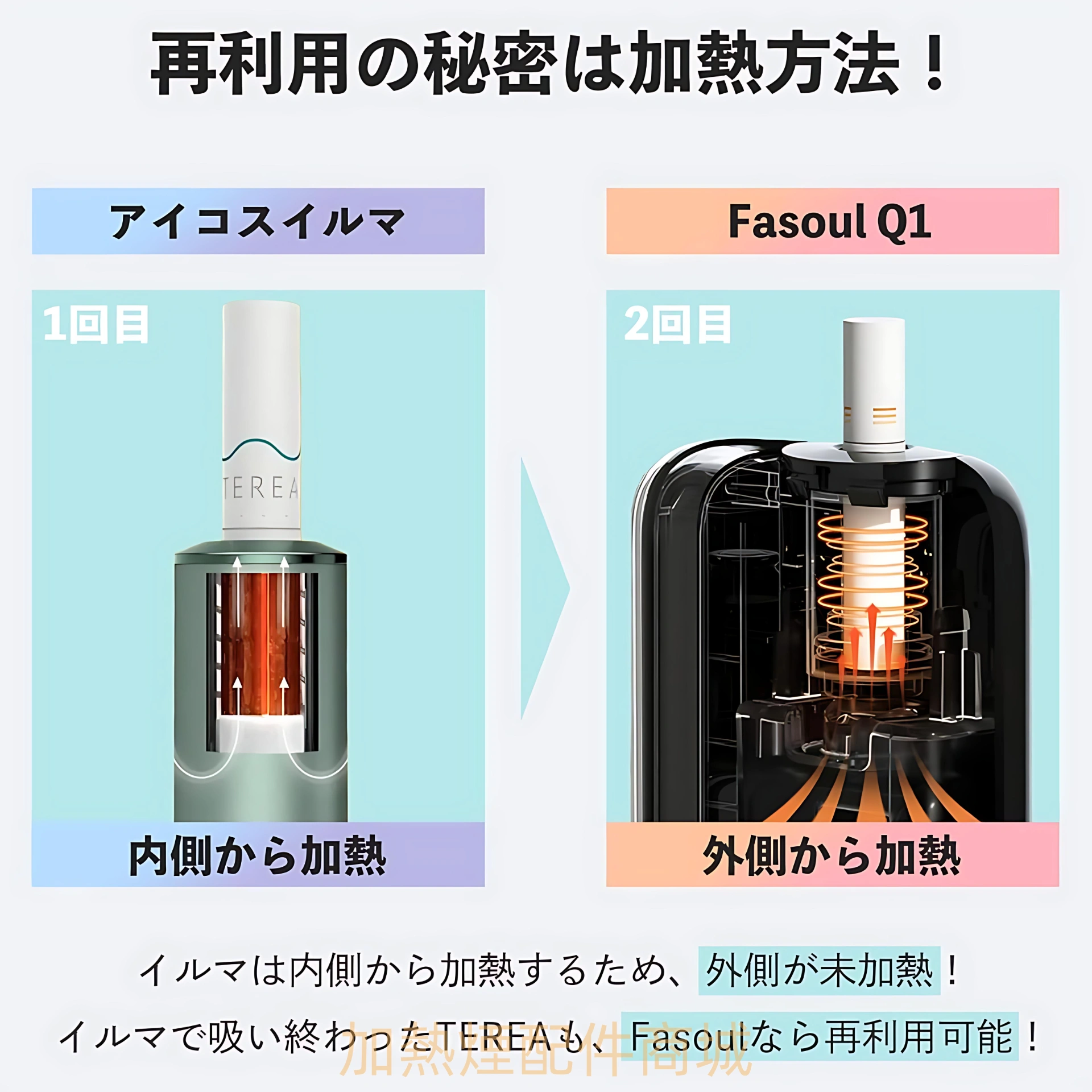 Fasoul Q1 最大賣點是其 二回加熱技術 — 將一支 TEREA 或 SENTIA 磁吸式煙彈進行 兩次加熱吸取,相比傳統 IQOS 裝置可更有效利用每一根菸彈,降低使用成本約 節省 50%。