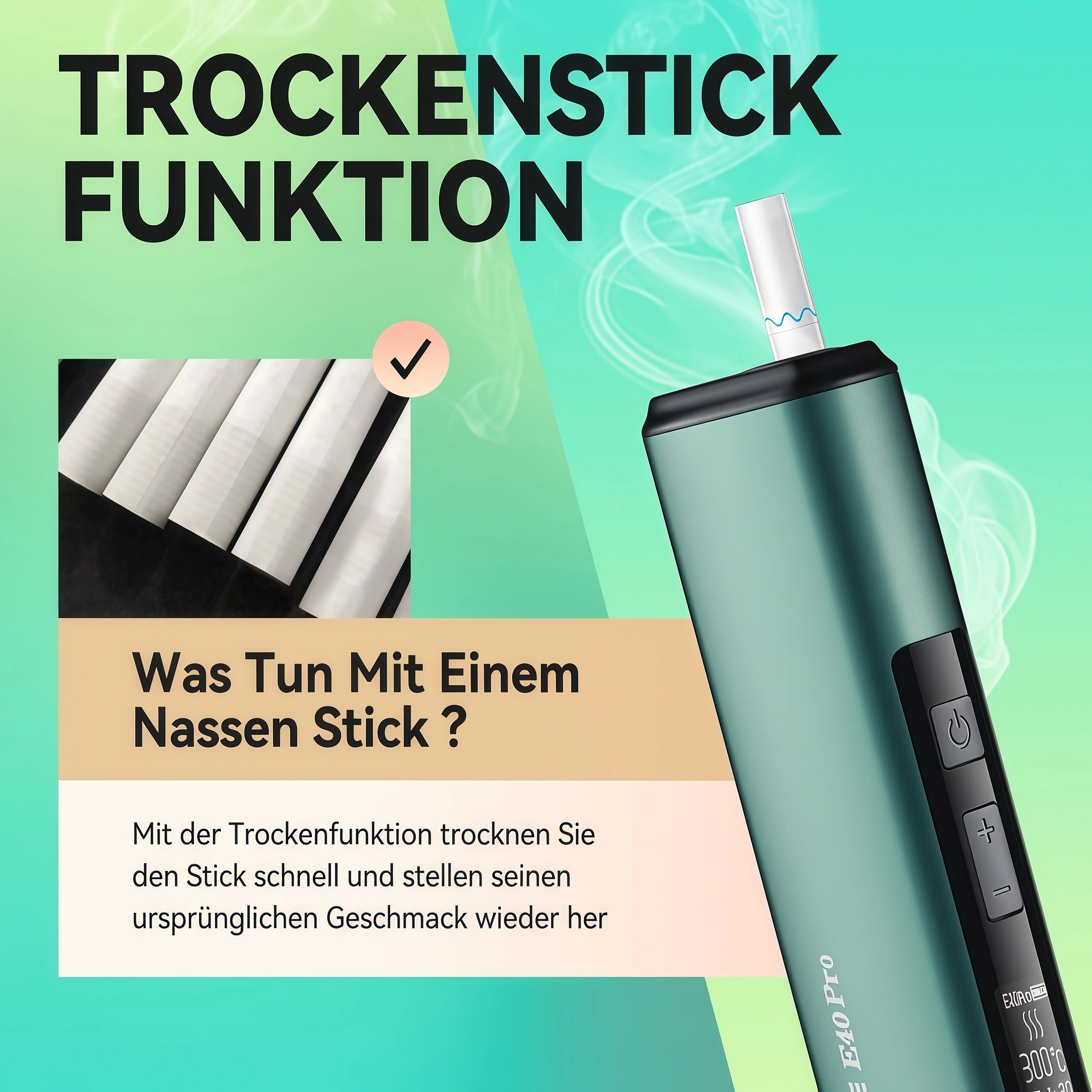 E40 Pro 的 乾燥(Drying)功能 可以在煙棒長時間暴露後,幫助除去潮氣,保持煙棒原有口感,避免因濕氣影響風味。